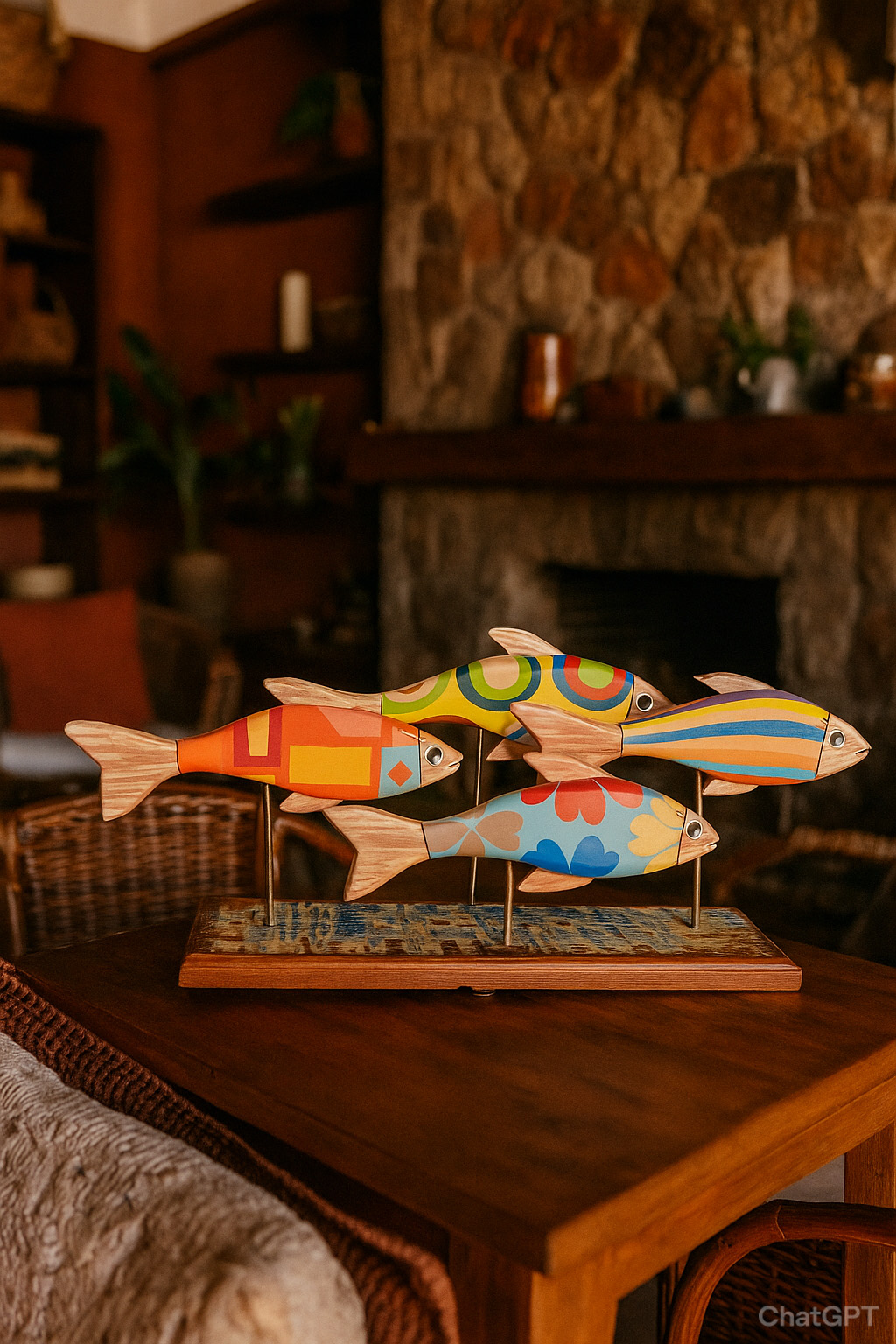 A peça é feita em madeira, com um bom acabamento. Os peixes são todos recortados, pintados a mão, dando um efeito de profundidade a peça. A diversidade de cores torna a escultura ideal para dar um tom de alegria ao ambiente. A peça possui base de madeira de demolição. Informações adicionais Cada projeto é único, o que faz desse quadro uma peça exclusiva. É tudo feito com muito amor e muita dedicação. Não é por acaso que o artesanato mineiro já é referência nacional e a cada dia tem alcançado um maior número de pessoas apaixonadas pelo trabalho manual de qualidade, feito para ser visto como uma verdadeira obra de arte.